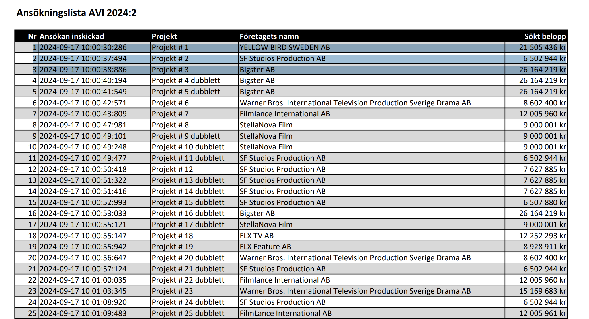 Vidare bekräftas det av ansökningslistan, i vilken det framgår att Bigster AB lyckades skicka in tre (!) ansökningar på en (!!) sekund. SF var också snabba, och fick iväg fem ansökningar på tre sekunder – men beviljades, liksom tidigare nämnd filmstudio, bara bidrag för en (budgeten var slut efter tredje ansökan).